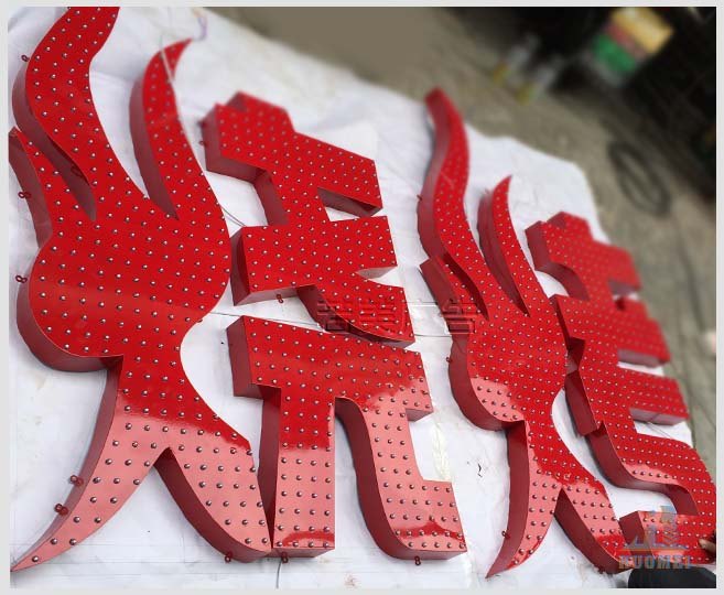 沖孔字一般采用鍍鋅鐵皮、不銹鋼板、鈦金板或鋁板做原材料,然后對(duì)這些板材進(jìn)行切割設(shè)計(jì),打孔、彎曲、開槽、焊接等工序進(jìn)行造型,然后再按這些造型來(lái)布置LED燈點(diǎn),塑型完畢再進(jìn)行打磨美工,氧化烤漆等,這樣一款光鮮亮麗的沖孔字就出現(xiàn)了,沖孔字多用在一些戶外的廣告招牌中,以它本身的優(yōu)勢(shì)來(lái)營(yíng)造更高的商業(yè)價(jià)值。