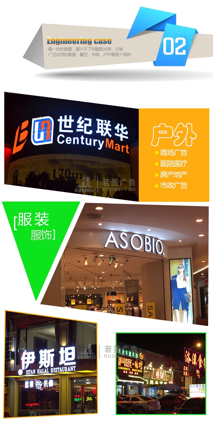 樹脂發(fā)光字也是廣告標識字的一種,它是由設計切割成各種字體/特殊形狀的金屬外殼,然后在金屬模具中布置led燈,最后再用特殊工藝在形狀模具中灌入樹脂等填充材料而形成的一款勻光、亮麗、耐腐蝕的品牌廣告字。