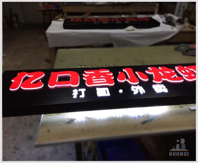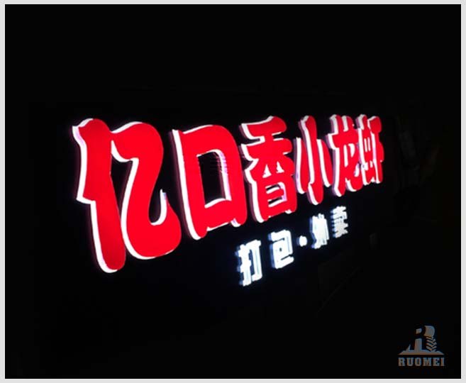 平面發(fā)光字是指表面發(fā)光的一張字體,這是若美廣告與億口香小龍蝦合作之億口香小龍蝦廣告招牌字制作,超光超量的字體可以瞬間吸引消費(fèi)者,美味生動(dòng)的蝦字可以促進(jìn)消費(fèi)者的食欲,從而達(dá)到廣告宣傳的目的,這樣能讓效益翻倍的平面發(fā)光字,您——一怎么能錯(cuò)過(guò)?