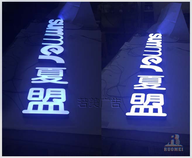 亞克力背光字,顧名思義是以亞克力為主要原料,然后結(jié)合LED背打光的方式制作形成的一款亞克力材質(zhì)的發(fā)光字,這款發(fā)光字多數(shù)用在室內(nèi)的廣告牌,也可以用在戶外,像跟若美廣告合作的富TOP酒家,富雍酒家這兩款廣告發(fā)光字就是以品牌廣告用在室外的。